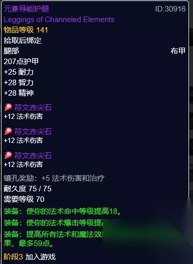 元素导能护腿,卡兹洛加掉落。两黄一蓝三插孔,奖励5法伤,智力、精神属性。