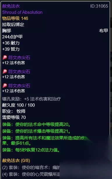 赦免法衣(T6) 赦免法衣(T6),伊利丹掉落。两黄一篮三插孔,5秒回蓝。 胸部建议首选T6套装胸凑4T6属性,海巫外衣和罗宁之袍作为备选,这两件装备的属性更多的偏向于命中和暴击。 护腕