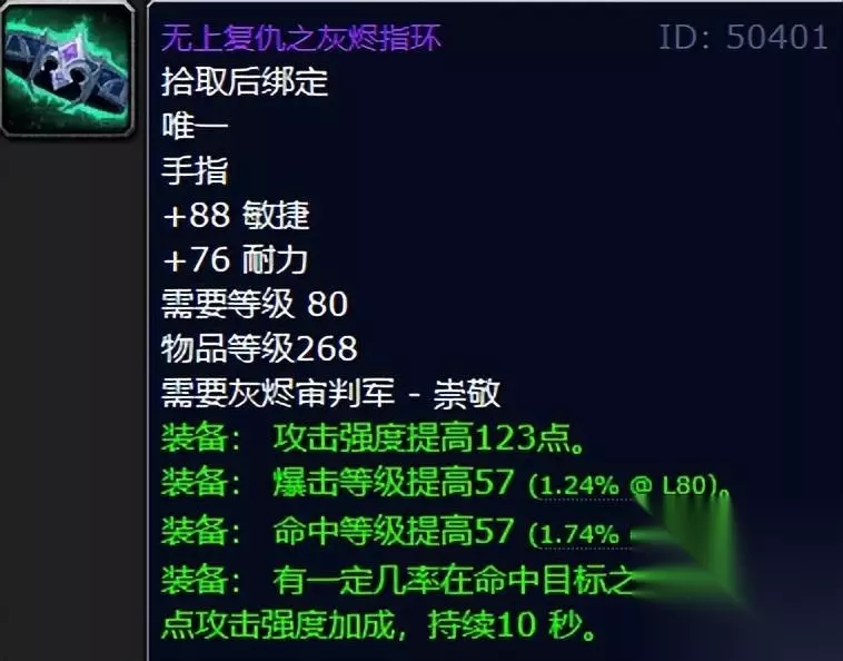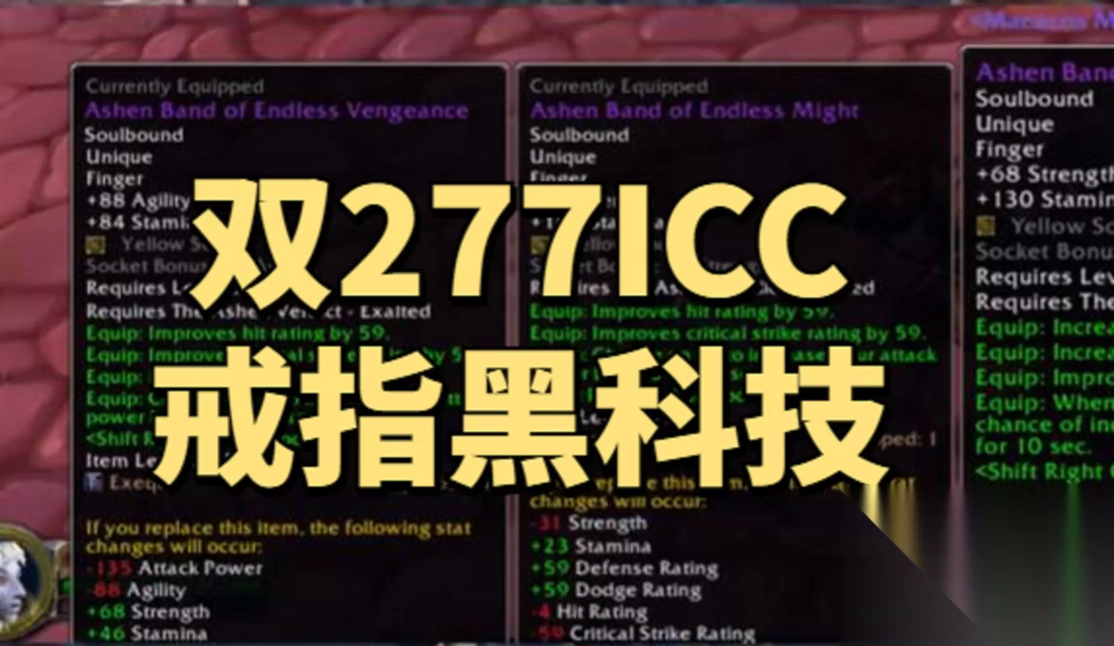 打个比方,猫德玩家目前灰烬审判军声望已经到达了崇敬,有一枚268等级的敏捷输出戒指,然后又把灰烬审判军声望升级到了崇拜。这时不要急着去升级,而是按照如下步骤做: 把268敏捷输出戒指摧毁掉,与NPC对话拿一个新的,再升级成277敏捷输出戒指。 把277敏捷输出戒指摧毁掉,与NPC对话拿一个新的,再花200G换成277力量输出戒指。 再摧毁、再与NPC对话拿、再花200G换,循环往复直到把需要的277声望戒指全部拿一遍。 ESC打开游戏菜单,点击客服支持,申请物品恢复,把前面摧毁过的戒指全部恢复,这样就可以最多拥有全部5种277声望戒指,还多一个268声望戒指。 这样一套操作搞下来很多职业都可以获得268+277或者双277戒指接近毕业,不过需要注意的双持灰烬审判军声望戒指时,只会触发其中一枚戒指的特效,因此双持277戒指不算是终极毕业。不过考虑到25人普通ICC和10人英雄ICC只掉落264等级装备,这个BUG对多数玩家也算是个不小的福利了。本来文章到这里就应该结束了,不过小编在发文前了解到根据玩家在今天上午的实测,暴雪似乎已经对此BUG进行了特修,目前玩家只能同时装备一枚灰烬审判军声望戒指,卡BUG的收益也只剩下双修玩家不用每次花200G换着用了。最后提醒各位玩家,使用BUG有风险,请谨慎行事。