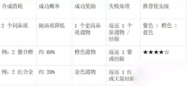 2. 过渡期搭配原则 无高品质遗物时:选择副属性多的遗物(如紫色遗物同时具备「增伤+暴击+生命」优于单一橙色属性) 六、避坑指南 合成误区 避免用橙色遗物硬合红色(成功率低于30%,建议攒鎏金币抽卡) 探宝陷阱 非UP池时,金色遗物出货率仅0.5%,优先在「限时UP活动」抽取 升星陷阱 红色遗物1星即可用,2星以上需权衡材料性价比(尤其是非主力武将) 总结建议 通过表格梳理后,核心机制更清晰易懂。建议收藏本文,搭配阵容时对照「职业适配表」选择遗物,养成时参考「合成/升星表」规划资源。 本文内容来源于互联网,如有侵权请联系删除。 ©