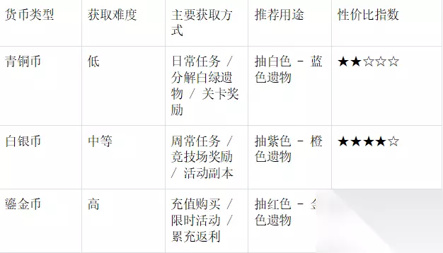 2. 各品质核心差异 白色至蓝色 仅提供基础属性 建议分解为合成材料或经验 三、遗物获取途径 1. 探宝货币对比表