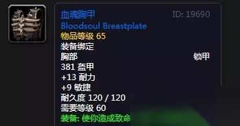 魔兽世界怀旧服血魂胸甲 装备效果: 381护甲 +13耐力 +9敏捷 效果:暴击提高2%