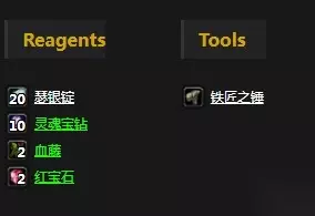 需要素材:瑟银锭x20、灵魂宝钻x10、血藤x2、红宝石x2 学习等级:锻造300 学习自:由图纸血魂胸甲学习,图纸在赞达拉部族声望崇敬购买。