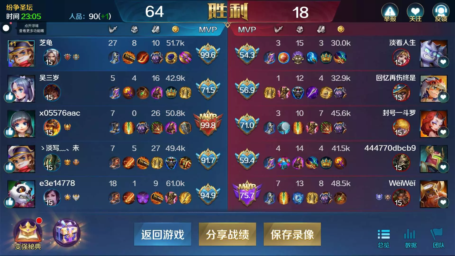 第三个为什么是MVP就杀了七个人,我虽然与他的死亡次数多了七个,但是我的人头数量真正比他多了20个,经济也比他多一些,为什么我是MVP而不是我呢,这太不科学了#英魂之刃