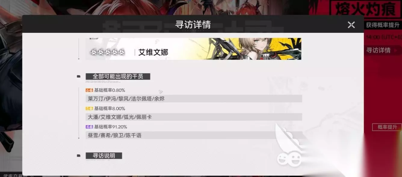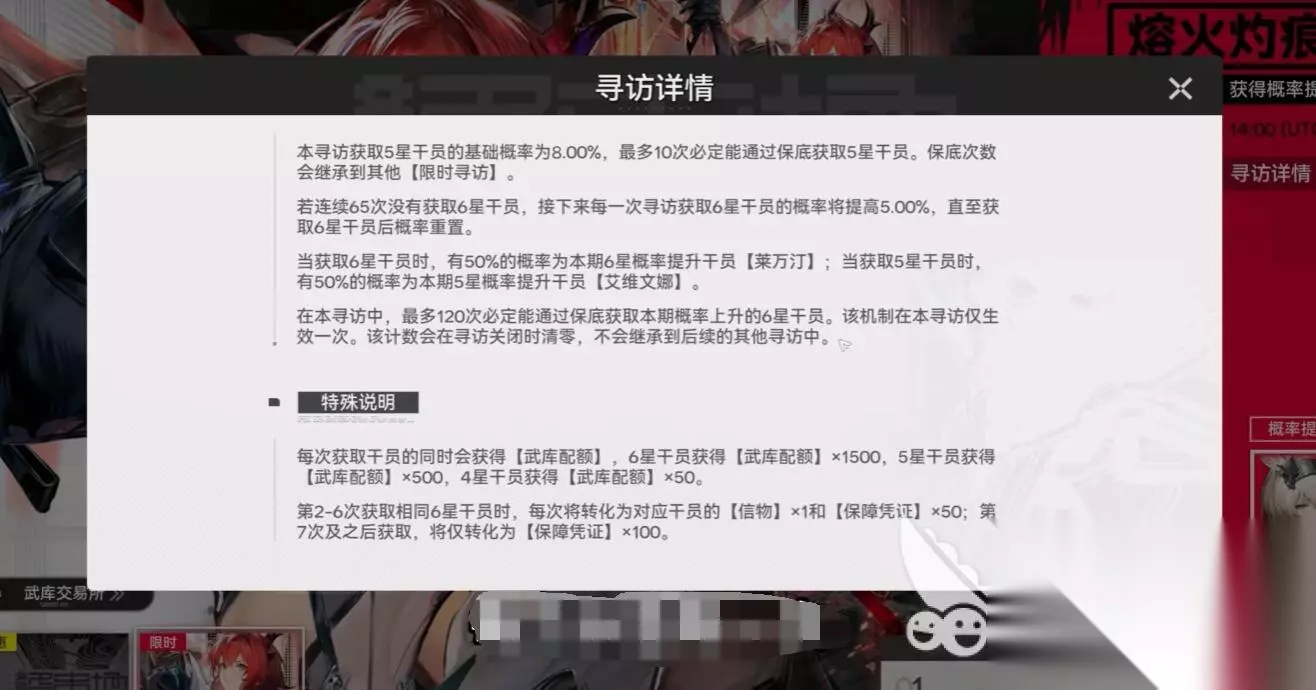 测试阶段六星干员基础的出货率在0.8%,每抽一次都是独立计算,基本上不拿后面概率增幅拿不到。增幅机制是六十五次未出六星后,第66次开始每次递增5%,第八十抽是六星保底。这一小保底机制在所有常规卡池通用。而且联合寻访池还有大保底,120抽内必出当期UP六星,但计数随卡池结束清零。新手前五十抽享有八折嵌晶玉(也就是原来的合成玉)优惠,同时还有必出六星的新手保底,保底之间共享次数,这个新手保底福利绑定账号,终生一次,错过不复刻。但是具体公测删不删档,或者说的这个新手保底会不会影响到正式版还不好说。