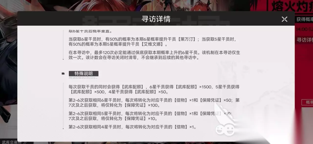 联合寻访池暂定是两周更新一次,UP干员两名,概率各占0.4%,其余六星平分0.4%,如果说大家的目标不在up位抽中概率会被稀释。单人UP池仅一名六星UP,概率0.8%,无大保适合补潜或补图鉴,不建议新手入。限定卡池一般是活动会出持续两周,大保底独立计数,错过返场时间未定,资源可以优先限定卡池,至于更新时间就不确定了。武器池与角色池配额互通,每获得一名六星角色赠一千五百配额,凑齐二千九百八十可十连武器,无需额外投入。