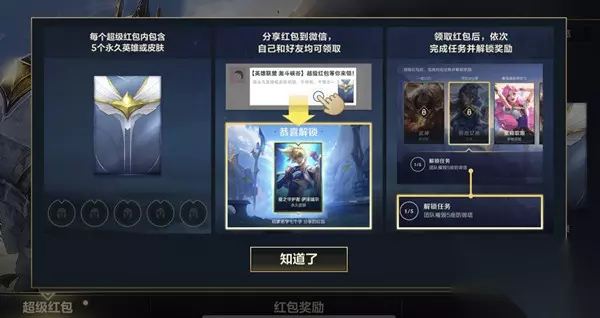 LOL英雄联盟手游超级红包怎么领? 超级红包:活动期间,召唤师可以领取井分享4个超级红包,每个超级红包包含5份奖励。每个超级红包,每个召唤师可以领取1次。领取首个红包后,剩下的红包根据时间逐渐解锁,时间为活动开启后的第2天,第3天和第7天。除此之外,我们还有代言人红包的大惊喜哦。 一共可以拿6次红包奖励,6次全部领完之后,总计包括4个英雄+2个皮肤 自己登录领的次数/好友分享的次数,你领了红包之后,领到的是一个任务,不是直接给奖励,完成任务之后,奖励才能到账 王俊凯的红包可以直接跳过任务环节,拿一次奖励,也算一个红包奖励次数 不管你通过自己登录领次数,还是好友分享次数,还是王俊凯红包拿次数,加起来的奖励最多就是6次(4个英雄+2个皮肤)