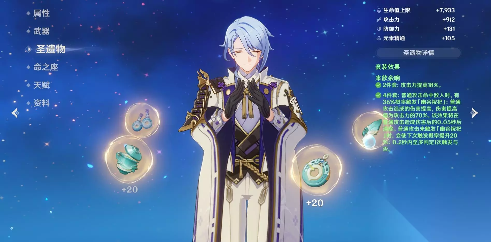 如果没有成功触发幽谷祝祀,那么下次普攻打中时的触发概率会提升,因此这套圣遗物的效果非常符合神里绫人的攻击方式。圣遗物部件的词条还是优先双暴和攻击,然后是生命,其中杯子的主词条可以用水伤加成。神里绫人战技提供的普攻增伤虽然是基于生命属性,但是增伤的幅度有限,因此生命属性的优先级要比攻击属性低一些。没有集齐来歆回响的话也可以用沉沦之心,它提供的水伤加成和普攻增伤效果也很适合神里绫人。