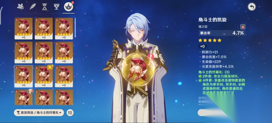 普攻增伤的效果虽然要在使用战技后才能获得,但是它的时间有15秒,而神里绫人的战技冷却只有12秒。因此实际上普攻增伤可以覆盖整个战斗过程,除了第一次使用战技前的这段时间。角斗士套装能够提供大量的攻击和普攻增伤,在没有以上两套时也可以用它,刚好神里绫人使用的单手剑符合圣遗物效果的触发需求。