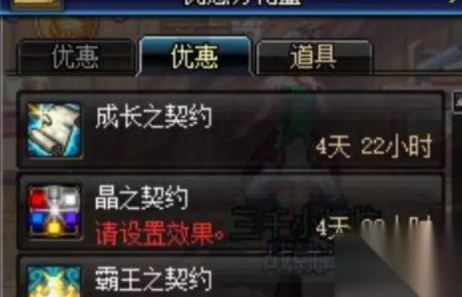 2、进游戏后点击如下按钮,就能在优惠系统中可以看到契约的持续时间及buff详细信息。如下图所示: