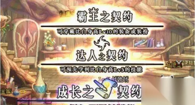 成长契约获得方法介绍: 1、直接的获得方法 进入商城,选择“道具”,找到“优惠”第二页,可以购买成长契约,成长契约分15天和3天期限,15天期限需要1290点券(也就是12.9元),3天期限需要790点券(7.9元),这种获得方式很方便,但是价格挺贵。 2、活动中获得。 通关地下城,在怪物身上会掉落特惠之心,收集15个特惠之心,就可以在暗黑城找到凯丽旁边的特惠专员。特惠专员处的商品,只有在整点才能兑换。 3、在整点时间,点击TV板就可以兑换对应商品。 可以用15个特惠之心兑换1个神秘的成长之契约礼袋,如果特惠之心不够的话,也可以在此商店处购买花30000金币购买1个特惠之心。需要注意的是1个账号只能最多兑换3个神秘的成长之契约礼袋。