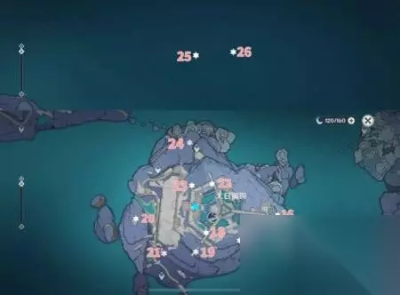 位置二十一 最下方传送点附近能看到一堆丘丘人,上方有一个洞,进去就能看到键纹,旁边还有个摩拉箱子记得捡