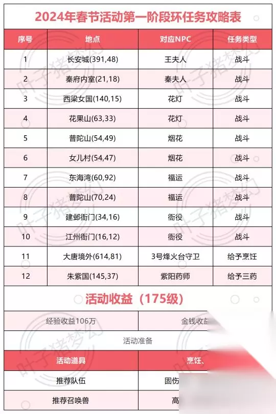 在环任务中,怪物存在“易伤”属性,大家可以根据其头上的BUFF变化判断“易伤”种类,达到快速刷环的目的。 二、可变身龙族召唤兽,决战固定为10回合 本次新春小副本是全阶段任务,持续时间为2024年1月30日12点至2月27日12点,≥50级的玩家,5人组队后可在福禄童子(长安城235,114)处开启任务。