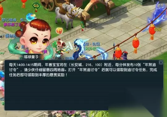 活动期间,每天14:00-14:15年兽宝宝将于长安城(208,99)召集征讨邪恶年兽的“年煞追讨令(每分钟10张)”,大家可以细留意长安城(208,99)周边地面,领取年煞追讨令时需支付50000金钱作为押金,完成追讨令任务后退回押金。 征讨令共计六场战斗,完成之后可以获得大量经验、金钱。需要注意的是,这六场战斗难度较高,比较适合满修且有一定装备基础的玩家参与!