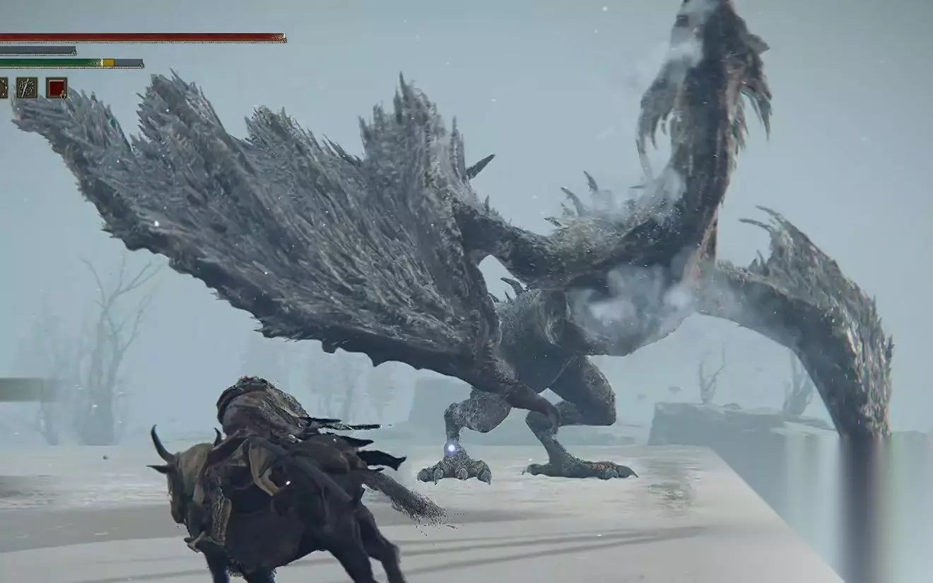 逃课流派:智取为上,安全第一 面对如此庞然大物,有时不必硬碰硬,智慧才是真正的武器。 核心装备:召唤强大的盟友是关键!将离群野狼的骨灰或水母的骨灰至少强化至+6。水母的剧毒对龙类生物效果拔群,是优选。 开场布局: 骑马进入湖区,锁定玻列琉斯后用弓箭射它一箭,成功吸引它的注意! 立刻调转马头!全速奔向岸边那三棵醒目的、并排生长的巨大枯树。 抵达枯树旁,迅速召唤你准备好的骨灰伙伴。 卡位精髓: 召唤后,你自己与冰龙保持大约两个战马身位的距离。 如果冰龙试图扭头溜回它心爱的湖心,别犹豫,再给它一箭!把它牢牢“钉”在这片区域。 核心技巧来了!通过精准的走位和射箭引导,让玻列琉斯“卡”在几棵粗壮的枯树之间。一旦成功,你会看到它在原地徒劳地转圈咆哮,攻击完全无法触及安全距离外的你。 胜利曙光:此刻,你只需惬意地站在它的攻击范围之外,悠闲地欣赏你的骨灰伙伴(尤其是不断叠加中毒的水母)一点点消磨掉这条冰霜巨龙磅礴的生命力。全程无需近身肉搏,堪称躲避苦手玩家们的福音!