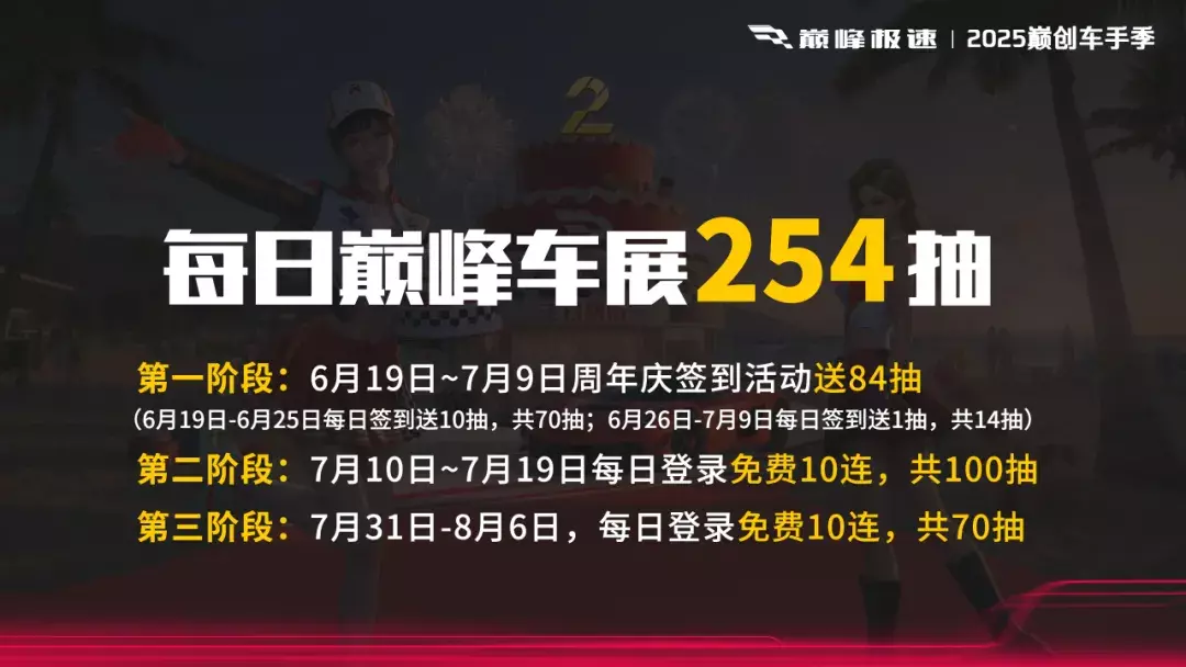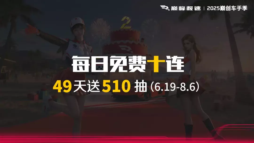第一波车展十连福利现已送达,6月19日-25日参与周年庆签到,每日可领免费十连抽;6月19日-8月6日“每日巅峰车展” + “自选传奇奖池”累计送出510抽!