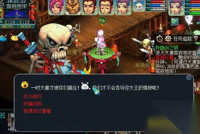 4.接着上面战斗结束,回到大唐官府与程咬金对话后,找陈潇然传送至大唐官府地牢。和npc对话选择哄骗诱拐。