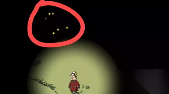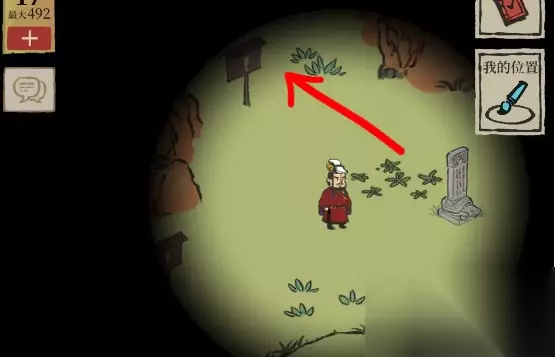 4、找扬梅看上去比较难,其实不是很难,到处走走都能找到,要请树枝结红果的杨梅树,点一下大石头或是杨梅树会变小可视范围,在其中发光的地方就是墓碑可以恢复视线,大约在初始部位左上方一点;
