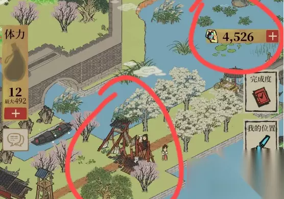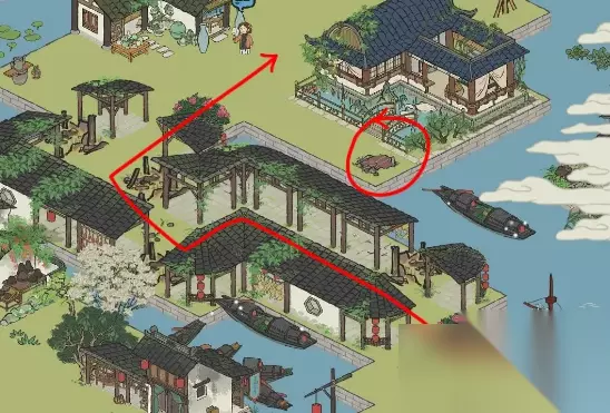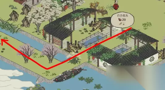 2、铜鹤相对性,必须按下面的图红箭头引导去掉香水百合和紫叶李抵达铜鹤,在其中需要玉山果需点击标志出来的发亮乌篷船,可另外得到补天石;