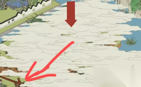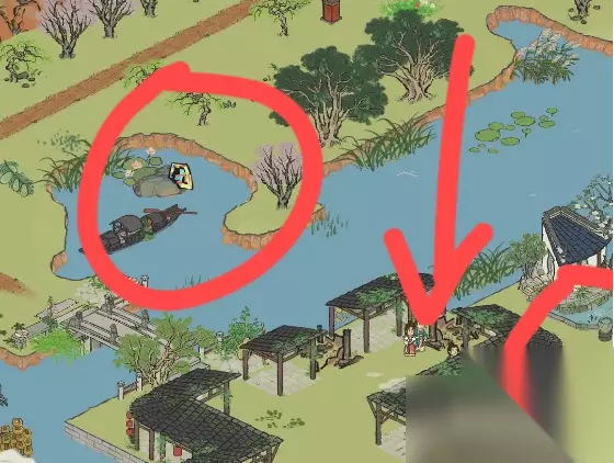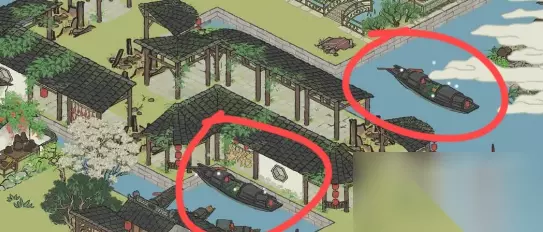 6、抵达下面的图任务后,可顺带点一下乌篷船,修补箭头符号废区,寻找第一个箱子,按左下方抵达绘图桌时,还记得点一下边上的乌篷船;