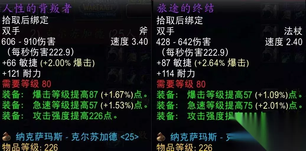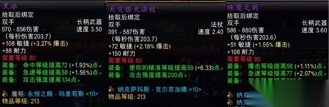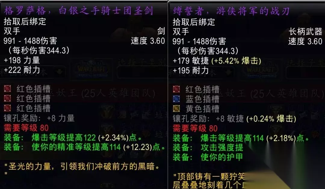 除了T7团本外,25人模式T8、T9和T10团本的最终BOSS都会掉落顶级长柄武器,堕落黑暗之刃和恶徒长戟属性优秀,看得小土人直流口水。不过比起同阶段的力量破甲双手武器还是因为没有力量而略逊一筹,只算是狂暴战的准BIS武器。