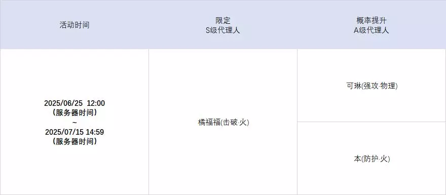 活动期间,限定S级代理人[橘福福(击破·火)]以及A级代理人[可琳(强攻·物理)]、[本(防护·火)]的调频获取概率将大幅提升!