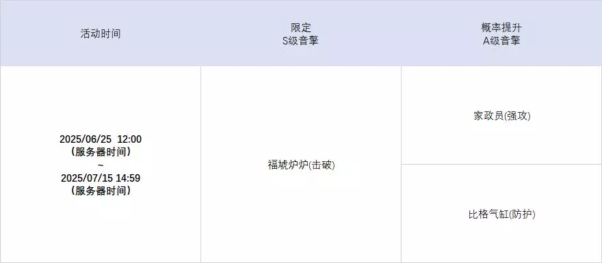 活动期间,限定S级音擎[福虓炉炉(击破)]以及A级音擎[家政员(强攻)]、[比格气缸(防护)]的调频获取概率将大幅提升!