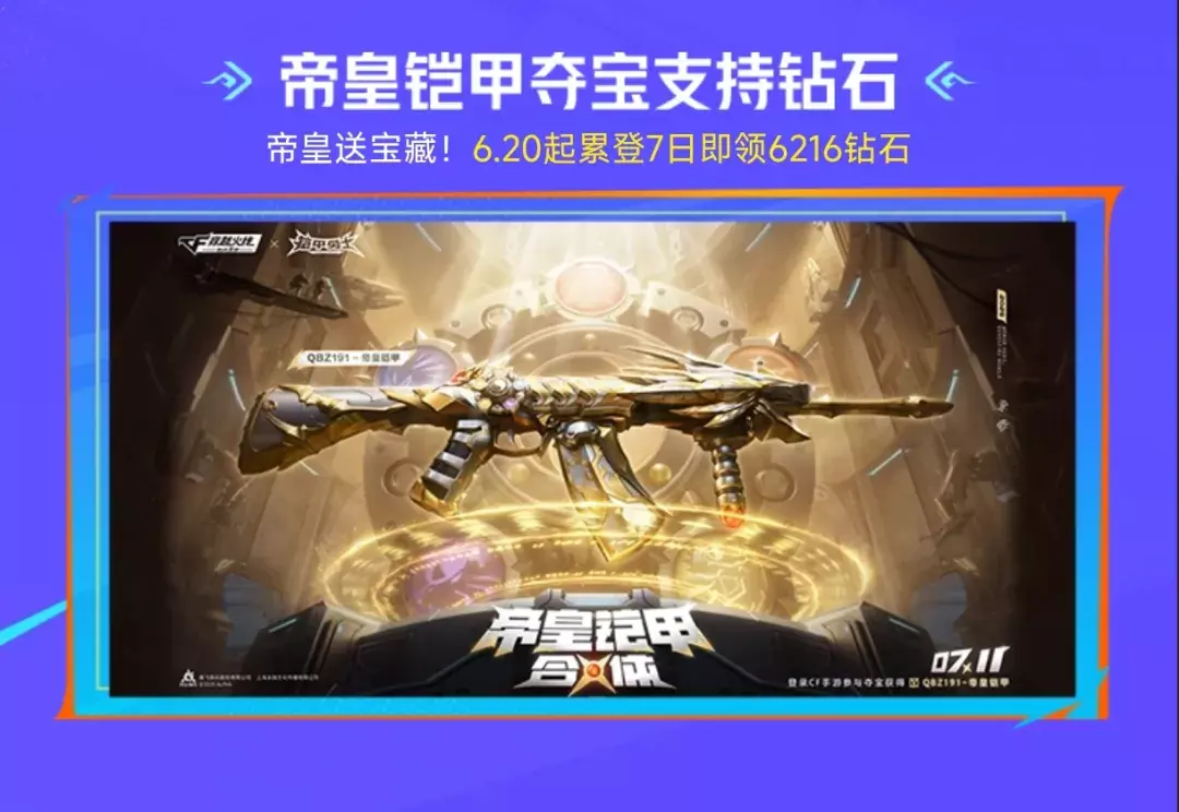 届时铠甲勇士联名套装QBZ191-帝皇铠甲、双管猎枪-极光盾、极光剑都可以花费钻石抽取,并且6.20起帝王送宝藏活动上线,累登7日即领6216钻石!助力大家拿下套装!缺钻石的CFer们千万不要错过哦~