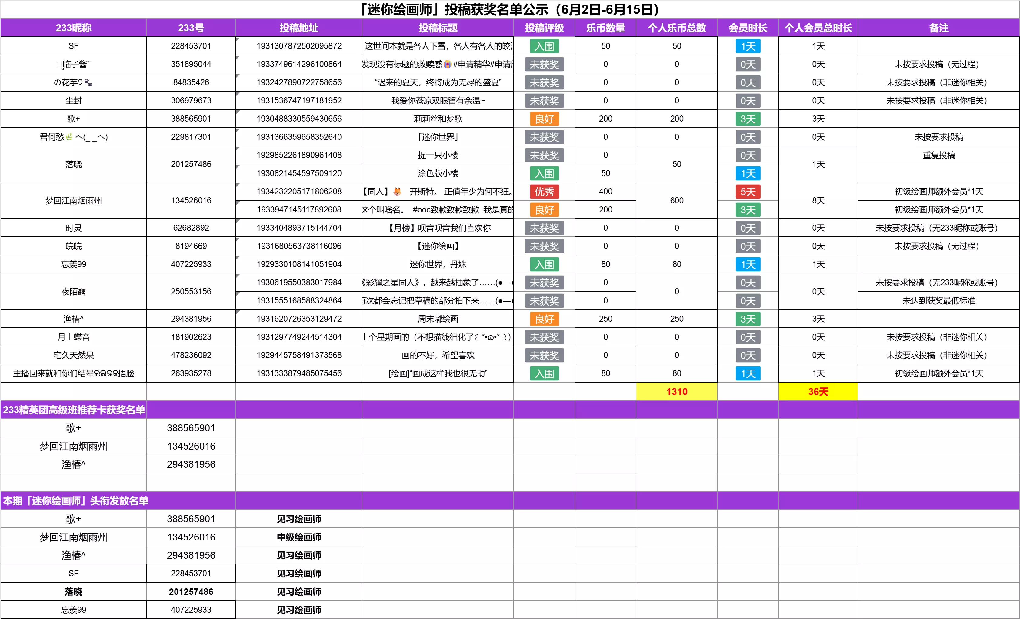叮咚,上期获奖名单出炉啦-让我们康康都有谁获奖了吧!欢迎大家持续参与到迷你绘画师招募活动中来,欢迎大家踊跃前来投稿尝试哦!#迷你世界绘画投稿
