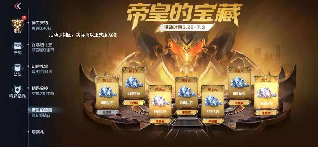 帝皇的宝藏活动时间为6月20日至7月3日共计14天。在活动期间内,每日登录签到即可领取888钻石奖励,7天签到累计可得6216钻石。没有套路,只需登录,钻石就到手啦!