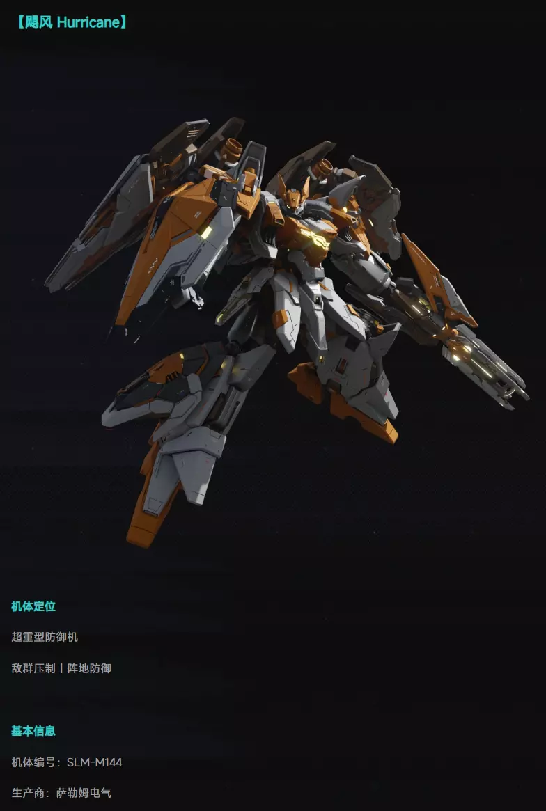 “飓风”是大洋联邦主力机体“地狱火”的姊妹型号,同样从属于大洋联邦某个极密开发计划,继承了由原型机“海棠”测试完善的多种新型防御武装,活跃于战场最前线,为友军机体提供强有力的掩护。“飓风”的开发工作早在多年前就已经完成,早期生产批次成功了拿下多个对成本不甚敏感的匿名客户。据悉该型机兵在行动中可轻易吸引和拦截大量故军火力,有效保存友军战力、降低作战损失,以其优异的防御性能备受客户好评。但该机正式量产的进程受高昂成本制约,迟迟无法顺利推进,直到新纪18年才攻克成本领正式交付联邦军队
