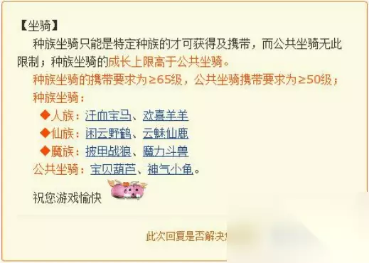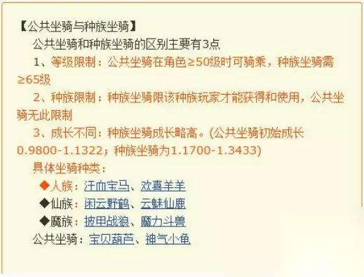 2、携带等级: 种族坐骑的携带要求为玩家等级≥65级,而公共坐骑的携带要求为玩家等级≥50级。
