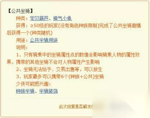3、种类数量: 每个种族都有2个种族坐骑,而公共坐骑只有宝贝葫芦和神气小龟两种。