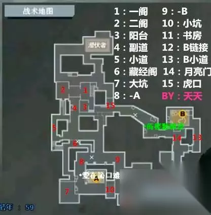 这次特地是用心做了一张简单的报点地图,基本上该写清楚的都为大家一一标注。其实供电这张图跟鹰眼有点类似的,都是经典的易守难攻,保卫方的优势可以说是非常大。 作为保卫方,保卫者可以选择从B同和中路同时前压,那基本上就是属于将潜伏方围在家里打了。当然,很多时候潜伏方会选择在虎口架狙,只是这时候一定要有队友协防,可以在中路阴沟再放一个队友,防止第一时间被压。 不过以我的经验来看,我一般是选择带一个队友来到中路,先将中路或者是B通排点清除之后,在选择配合队友冲A还是B,相信我,供电所这张图作为潜伏方还是这个方法管用,当然前提是你能先破点!