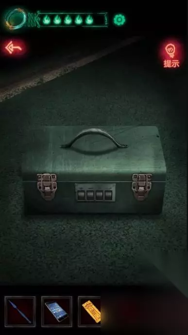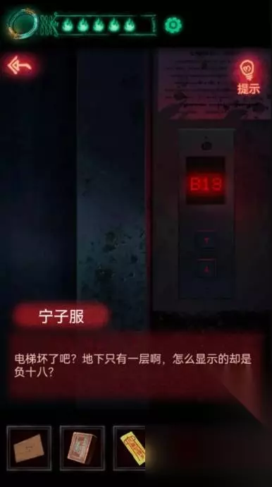 23、回保卫室把对讲机听筒安上老人说电梯归你了,所以我们可以使用电梯了,可以来到之前去不了的-1层,先点右下绿色箱子提示密码是元宝、鱼、鸟爪、鹿角,对应的就是门上贴的年画楼层号了,依次为8265,打开获得黄色指针和字帖。