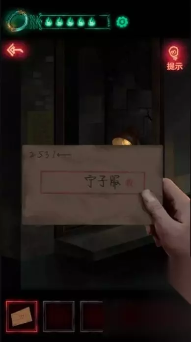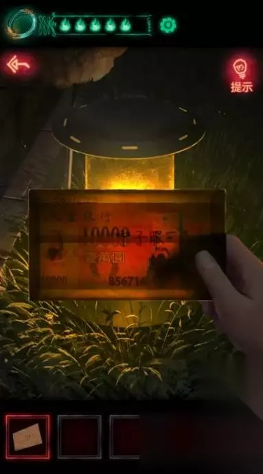 4、拿着信封点一下右下角黄色景观灯,透过信封能看到里面冥币,编号856714记下来。