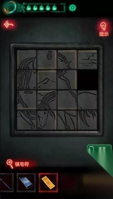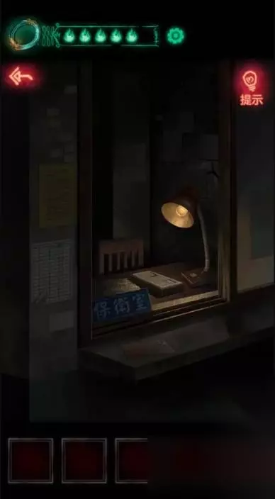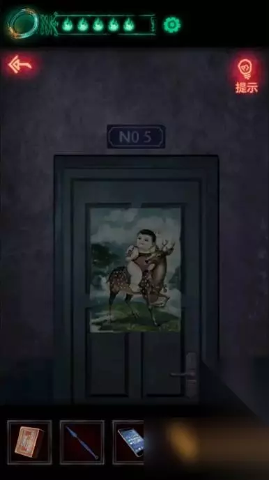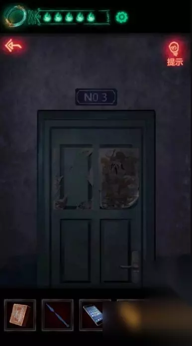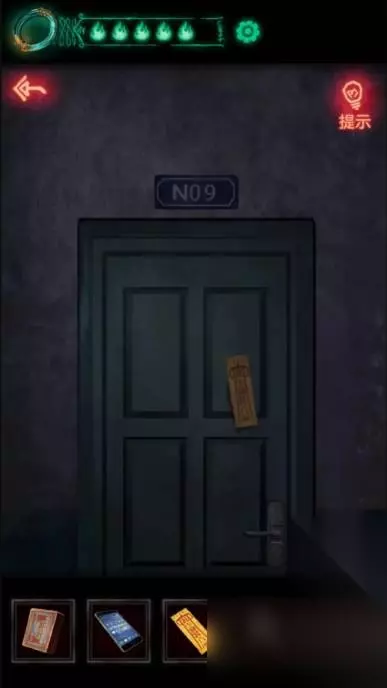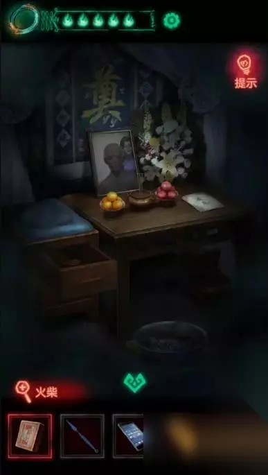 17、把刚刚拿到的年画放进左下角火盆中然后点燃,触发报警器喷水浇灭绿色火焰,火焰灭掉之后向上走的路就出来了,一定记得再看一眼手机,因为其实路是向下走。