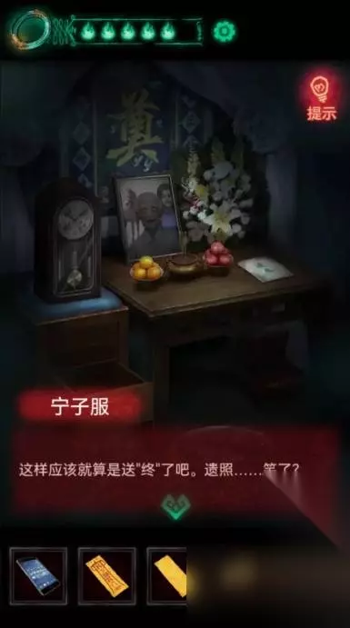 13、继续走到四楼,先点一下遗照前供果,第一个苹果拿下来发现上面插了个红色表针,仔细看,表针和苹果颜色接近很容易漏掉。