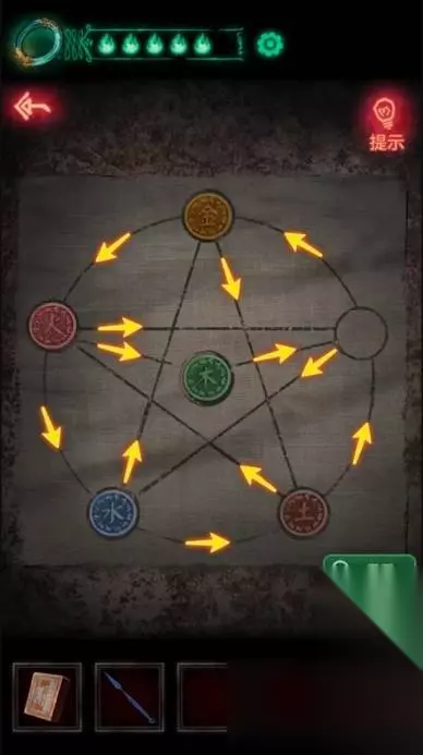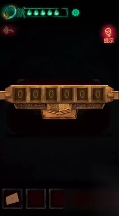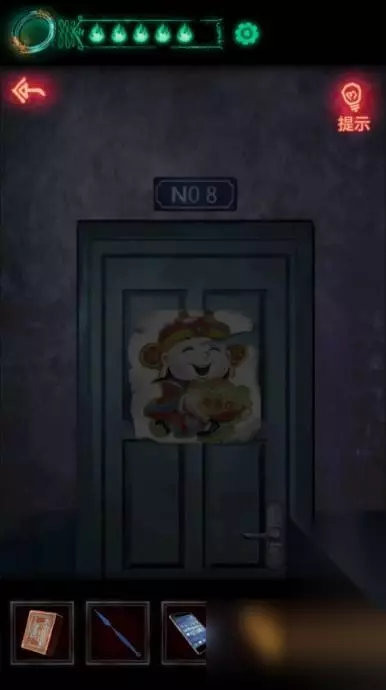 7、桌子下面阴影处有个红色密码箱,六个字的,现在得到的六字密码只有856714,输入拿到火柴可以走人了,来到大门口把八卦的密码34456输入就能进去了,进去之后电梯上拿到符咒,电梯坏了用不了。