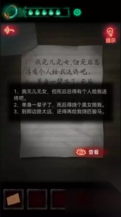 5、进入左边帐篷看桌子上遗书,重点三个:送终、美女、骏马,这就是一会的目标了。