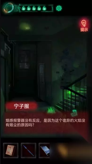 16、再继续走到达七楼,这里就根本无法向上走了,先捡起来地上符咒,查看火焰提示火焰颜色不对劲,查看报警器提示这个特殊火焰没有烟尘,那么我们要做的就是手动给点烟尘。