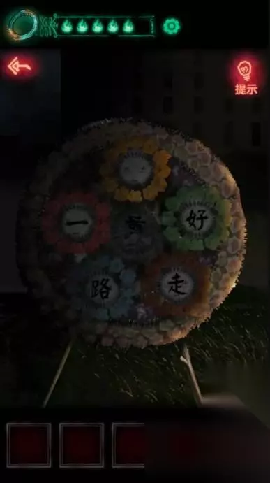 《纸嫁衣1》第三章攻略 1、剧情过后先点最明显的花圈,记下花圈颜色:从最上面开始顺时针黄绿橙蓝红。