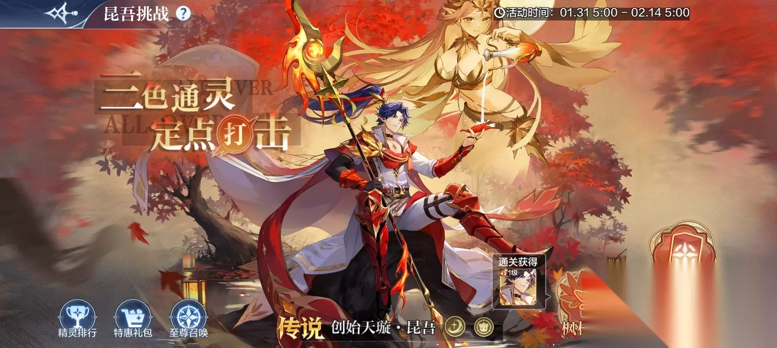 七、【王者无烬】全服前8888名获得专属印象贴! 活动时间:1月28日9:00-2月14日5:00 活动内容: 全服前8888名获得烈焰王者·无烬的玩家可获得专属印象贴,根据王者无烬全服获得名次领取专属编号印象贴,战斗中王者无烬释放超杀,显示对应名次印象贴 八、【创始天璇·昆吾】挑战得创始天璇·昆吾(最快1天) 活动时间:1月31日5:00-2月14日5:00 活动规则:通关极限挑战即可获得精灵【创始天璇·昆吾】,通关全民挑战可以获得限时至尊券,在至尊卡池中召唤获取 挑战分为【枫林奇阵】和【自然试炼】,通关【枫林奇阵】即可获得创始天璇·昆吾。 【枫林奇阵】 1.分为上、下两层,每层有3个平行关卡,通关3个关卡且满足通关条件即可通关该层。 3.每个关卡都拥有1个BUFF,在被通关后,与其同层的未被通关的关卡也会获得它的BUFF。 4.需要上阵4个与关卡属性相同的精灵才能够进行挑战。 5.达成上、下两层的通关条件后,即可完成挑战获得创始天璇·昆吾。 【自然试炼】 1.玩家拥有水火草三个属性的BUFF,BUFF只对对应属性的精灵生效,每个BUFF的具体数值每日刷新。 2.每日刷新3个敌阵,挑战时使用系统属性进行战斗。 3.根据通关的关卡数来解锁奖励。