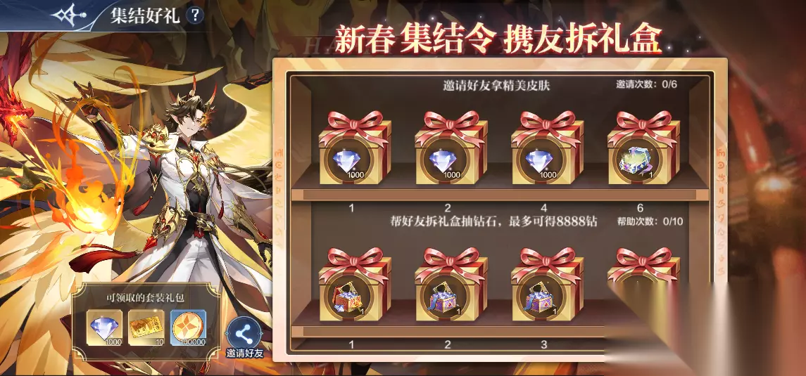 十六、【新春拆礼盒】开礼盒赢超值好礼! 活动时间:1月24日5:00-2月28日5:00 奖励预览:钻石*8888、随机传说精灵箱(新增暗祭·达克诺斯、征战诡影·余灰、神执统帅·特莎姆、赫魔莉·青骨、神爵·龙尊圣主、神罚·秩序圣龙等传说强宠)、皮肤自选礼盒(新增名门侦探·帝释天、机械大师·阿瑞斯、时光执事·诺亚)或皮肤币*50 活动内容: 完成活动任务,助力开礼盒,即可抽取超多好礼~ 拆礼盒概率开出:8888钻石、达克诺斯、余灰、特莎姆、青骨、龙尊圣主、秩序圣龙等精灵 完成进度奖励可获得:指定皮肤自选箱*1 1、游戏内分享专属链接给好友,好友进入页面参加活动,即可抽取奖励获得传说精灵跟钻石奖励,奖励将在游戏内通过邮件发放。 2、每个玩家角色只能帮助指定的角色一次,最多帮助10名玩家角色,帮助6名玩家后无法再获得帮助奖励。 3、当邀请回归或新手玩家协助拆礼盒,可以额外获得一份奖励。 注:回归玩家即21天内未登录,登录后10天内保持回归身份,新手为注册未超过10天玩家。 4、同一天梯账号下的不同角色无法互相帮助拆礼盒。 5、邀请好友达6次后可得皮肤自选礼盒(新增皮肤:名门侦探·帝释天、机械大师·阿瑞斯、时光执事·诺亚) 6、帮助好友达成次数后可抽取精灵&钻石奖励(新增精灵:暗祭·达克诺斯、征战诡影·余灰、神执统帅·特莎姆、赫魔莉·青骨、神爵·龙尊圣主、神罚·秩序圣龙)