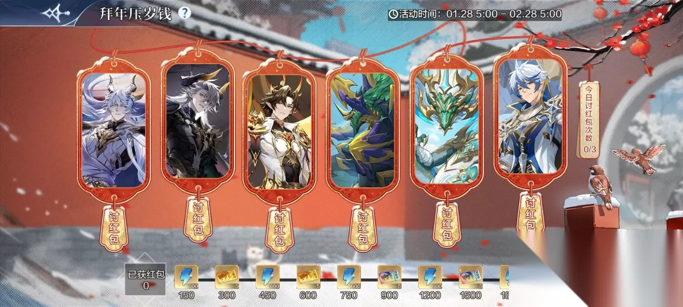 十三、 【烈虹焕岁—新春烟花】烟花贺新年,好礼拿不停! 活动时间:1月28日5:00-2月28日5:00 活动奖励:体力*3000、金币*300万、神唤券*10 活动内容: 1、每天指定的时间段,会在不同的场景刷新出各个主题烟花 2、前往对应场景后,需手动寻路,点击对应的烟花,即可点燃主题烟花,许下心愿 3、每日每个单独的时间段内中的烟花,只能点燃一次,到下一个时间段后刷新出的烟花可继续点燃 4、点燃烟花达到指定次数后,可领取相应的个人进度奖励 5、当主题烟花总计点燃达到指定次数后,可领取相应的世界进度奖励 十四、 【烈虹焕岁—新春口令】春节卡点送祝福,领气吞山河! 活动时间:1月28日5:00-2月28日5:00 活动内容: 1月28日0点起,在世界频道发送春节祝福语即可领取气吞山河*1 1月28日-2月4日,每日使用新年祝福语在世界频道发送即可领取奖励,累计8日可获得金币*2025万、传说之魂*1、火系橙+1装备*1、召唤券*10、红色灵纹自选箱3.0*5、炼金石*10、 神唤券*10、金色输出星神自选*1" 奖励预览: 春节祝福口令:气吞山河*1 春节口令: 第一天:金币*2025万 第二天:传说之魂*1 第三天:火系橙+1装备*1 第四天:召唤券*10 第五天:红色灵纹自选箱3.0*5 第六天:炼金石*10 第七天:神唤券*10 第八天:金色输出星神自选*1 十五、 【烈虹焕岁—拜年压岁钱】群龙齐聚贺新春,压岁钱拿到手软! 活动时间:1月28日5:00-2月28日5:00 活动奖励:体力*3000、淬源晶石*100、召唤券*10、神唤券*10 活动内容: 1、选择一位精灵向他讨红包,精灵会开启红包雨,接取红包雨累计积分可领取对应的进度奖励 2、开启红包雨小游戏后,会有三种不同的红包 加时红包:接到后可增加5秒游戏时间 加分红包:接到后可增加5游戏积分 普通红包:接到后可增加1游戏积分