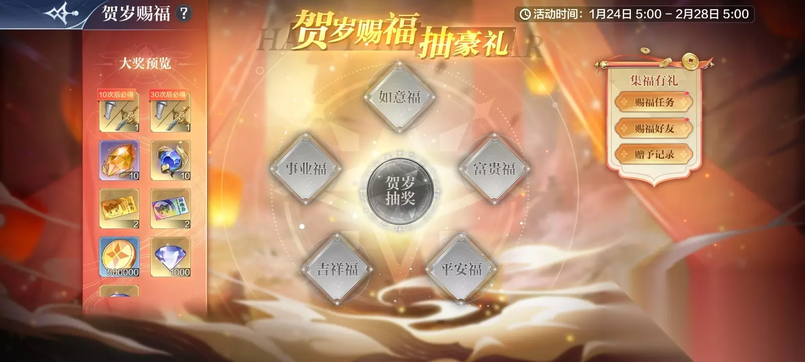 十二、【烈虹焕岁—贺岁赐福】六艺赐福,集五福领好礼! 活动时间:1月24日5:00-2月28日5:00 活动奖励:灵纹经验*50万、淬源晶石*100、法度秩序神器2选一*2、召唤券*10、神唤券*10、钻石*1888、金币*300万 活动内容: 1、活动期间内,只需要完成赐福任务,即可获得随机五福!如果集齐的速度太慢,还可以发送心愿单,让好友给你带来五福噢! 2、当集齐五福时,即可合成五福在奖池中抽奖!若奖品被抽完,将会贴上【已抽完】的标签,无法再抽中。