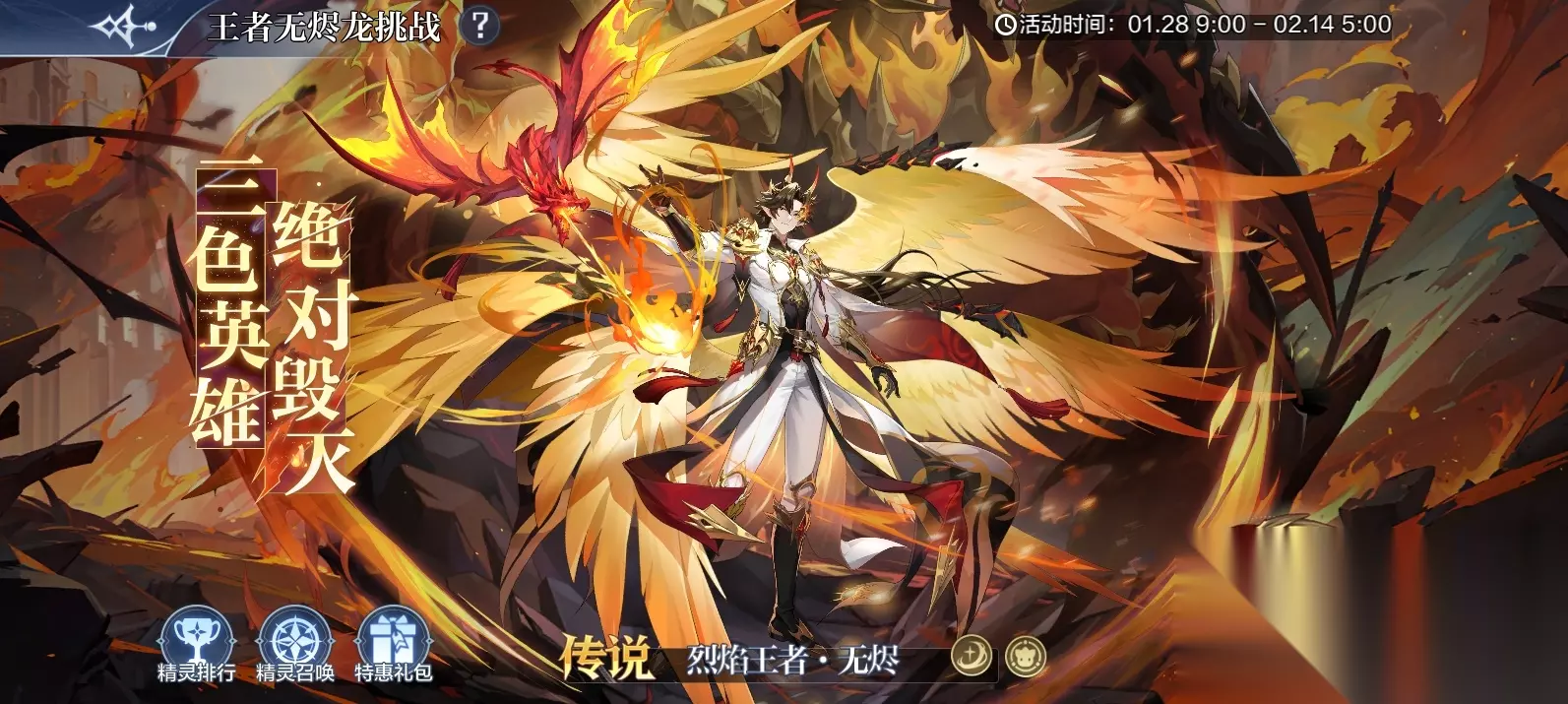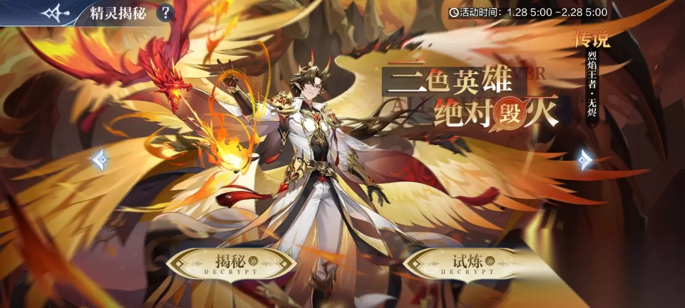 五、【烈焰王者·无烬】挑战得烈焰王者·无烬抽奖券*120(最快1天) 活动时间:1月28日9:00-2月14日5:00(挑战、抽卡券开放购买、幸运抽神宠均为9点开放) 活动奖励:王者无烬券*120 活动规则: 1、线性关卡,破阵即可通关,通关后自动进入下一关 2、破阵后,我方死亡精灵所在站位残留余烬,进入下的关卡时,在该站位上的精灵每次行动时,对己阵生命值最低的2位存活精灵造成攻击*140%的毁灭伤害 3、多个关卡在相同的位置上死亡将叠加余烬层数,最大3层 4、所有关卡每产生一个余烬,则剩余关卡中敌阵受击后,对伤害来源造成自身攻击力*20%的毁灭伤害,最多可叠加9层 5、破阵后,封印我方存活的精灵,在后续的关卡中不可上阵 6、可以将全部关卡重置为未挑战,解除精灵封印,奖励不重置