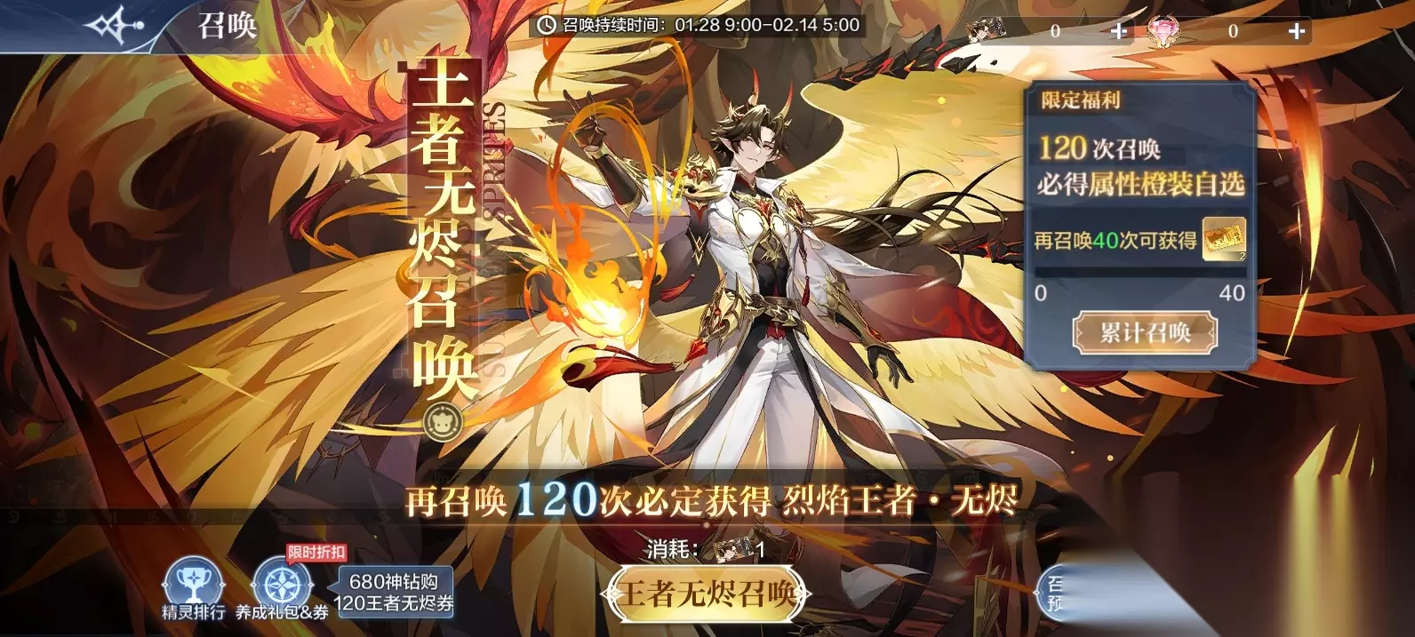 六、【王者无烬】120抽必得烈焰王者·无烬 活动时间:1月28日9:00-2月14日5:00 累计召唤奖励一览: 累计召唤40次:召唤券*2 累计召唤60次:召唤券*3 累计召唤80次:随机橙装宝箱*1 累计召唤100次:随机橙装宝箱*1 累计召唤120次:火属性橙色装备自选箱*1 累计召唤160次:烈焰王者无烬之魂*1 累计召唤200次:火属性+1突破石 累计召唤240次:烈焰王者无烬之魂*1