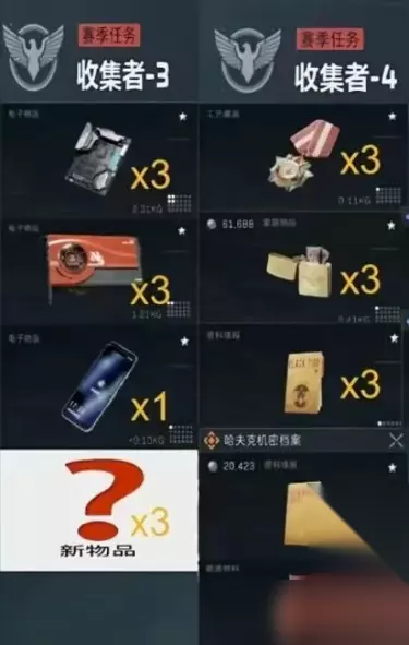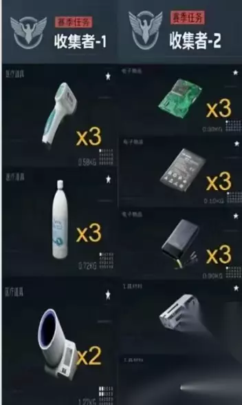 三角洲行动新赛季3x3安全箱收集者任务提前进行爆料,接下来小编来为你进行介绍一下,根据爆料用户能查看各种收集者的任务,玩家能提前囤积一下,优先购买这些货物,快速完成新赛季的安全箱的部分的任务。 三角洲行动新赛季3x3安全箱收集者任务线总览 收集者1:靛蓝色额温枪三把 、蓝色消毒酒精三瓶 、紫色血压监测器两台。 收集者2:绿色LED灯管两根 、蓝色转换插头三个、绿色印刷电路板三块、绿色手机电池三个、蓝色军用便携电源三套。