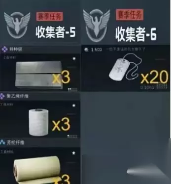 收集者5:紫色特种钢材、紫色聚乙烯纤维、蓝色芳纶纤维。 收集者6:蓝色特种作战人员身份牌二十个。